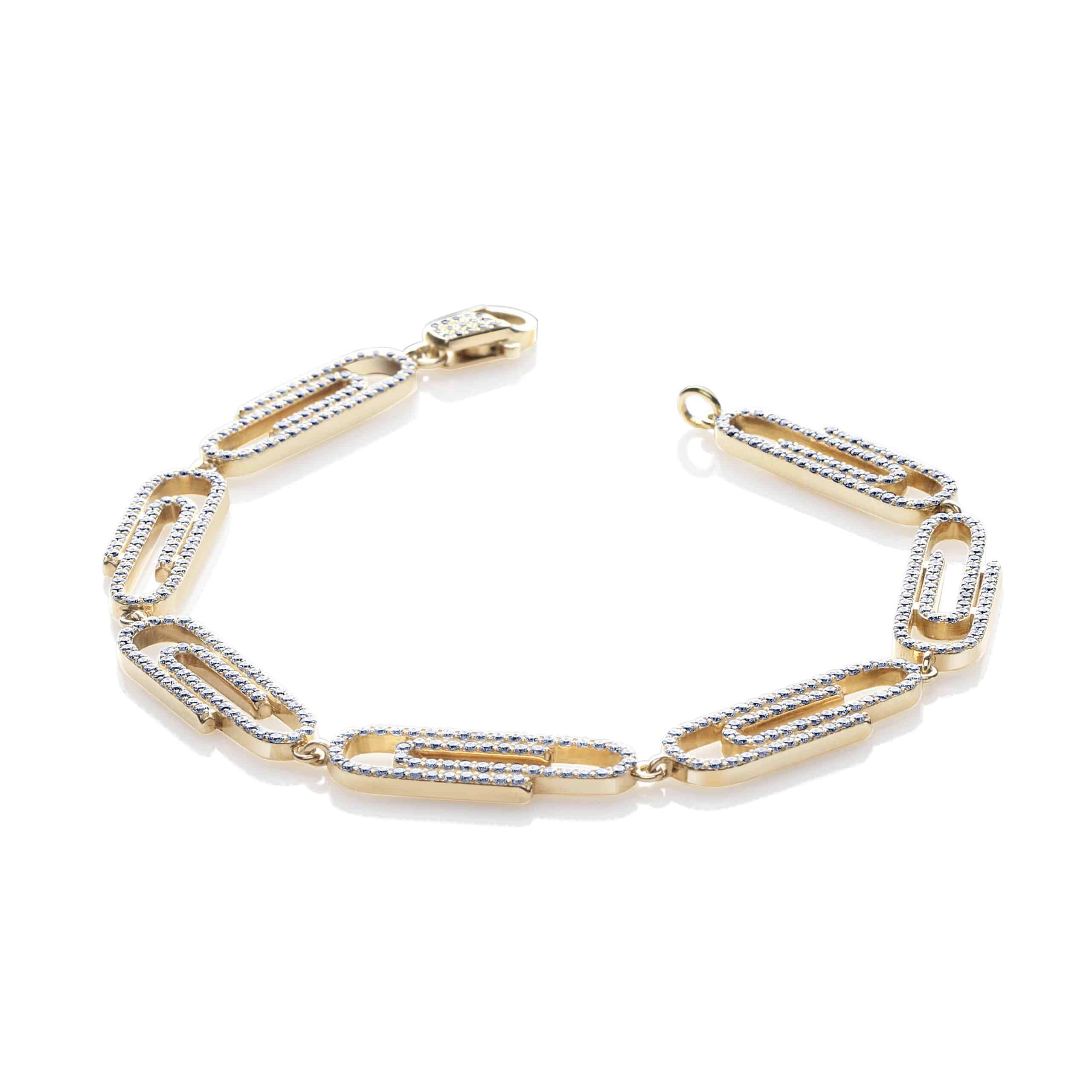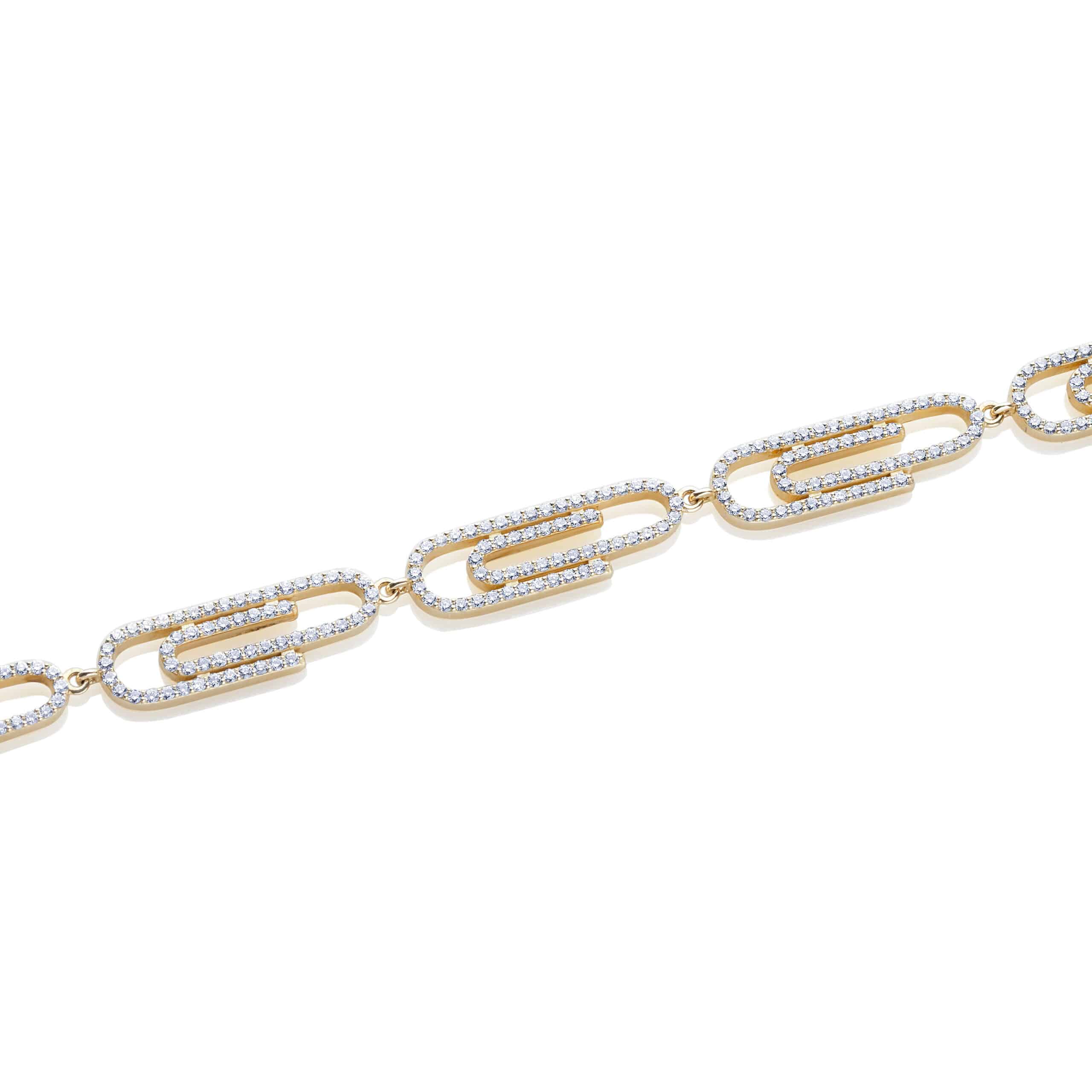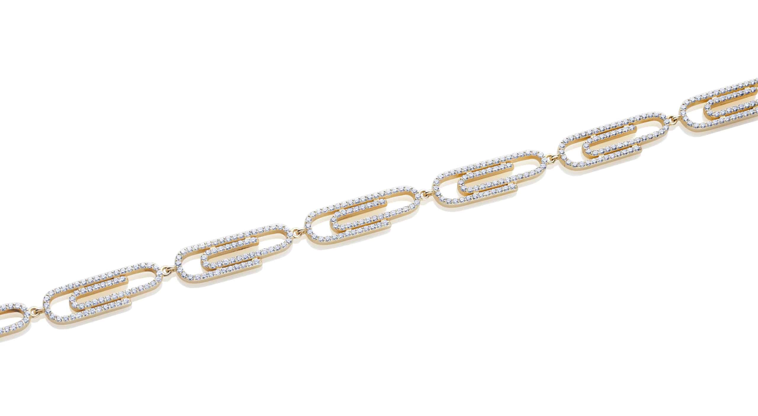 Kancelárske spinky už dávno nepatria iba medzi štósy papierov a na masívne dubové stoly. Prinášame jednoduché prevedenie šperku, ktorý so sebou nesie štipku hravosti a ducha nekonvenčnosti. Paper clip náramok je zhotovený zo 14 karátového žltého zlata a je inšpirovaný tvarom ikonického predmetu každodennej spotreby. Náramok s dĺžkou 20 cm v tvare papierových spiniek sa stáva symbolom vašej kreativity a schopnosti nájsť krásu v jednoduchosti. Priama línia trblietavých brilliantov poukazuje na precíznosť a jedinečnosť settingu. Nápaditý dizajn, do ktorého sme osadili 140 kusov diamantov, s celkovou hmotnosťou 2,05 ct dokonale poukáže na ľahkosť a sofistikovanú eleganciu. Bez ohľadu na to, či ho nosíte na denné stretnutia alebo špeciálne príležitosti, tento náramok bude rozprávať príbeh vášho unikátneho štýlu.