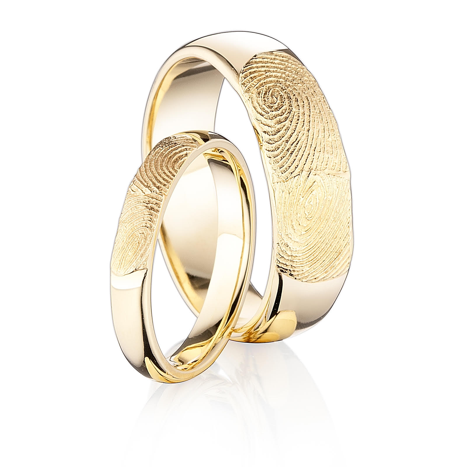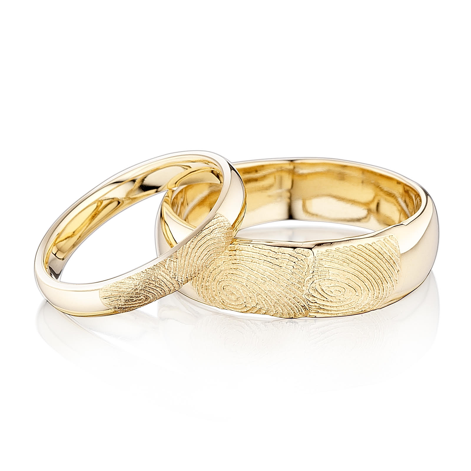 Moderný dizajn týchto svadobných obrúčok spočíva v ich jednoduchosti. Čo im dodáva punc originality a otvára dvere úplnej novej kategórii, sú personalizované odtlačky prstov. Jedinečný spôsob zachytenia štruktúry vašich odtlačkov a ich prepojenie zvečnené na každej obrúčke zvlášť. Dámska svadobná obrúčka s elegantnou šírkou 3 mm, jemne ozdobí ruku svojej nositeľky. Pánska svadobná obrúčka s impozantnou šírkou 6 mm, dodá vášmu štýlu na mužnosti. Tento pár v sebe ukrýva očarujúci príbeh a zároveň odráža lásku a spolupatričnosť. Tieto obrúčky sú to najosobnejšie čo sme kedy vyrobili.