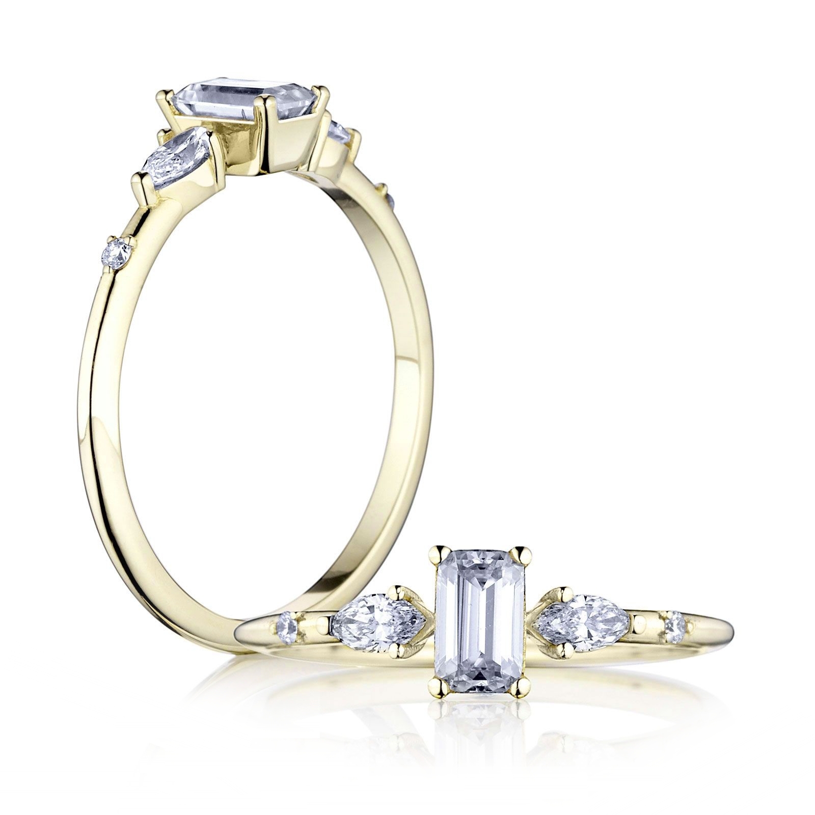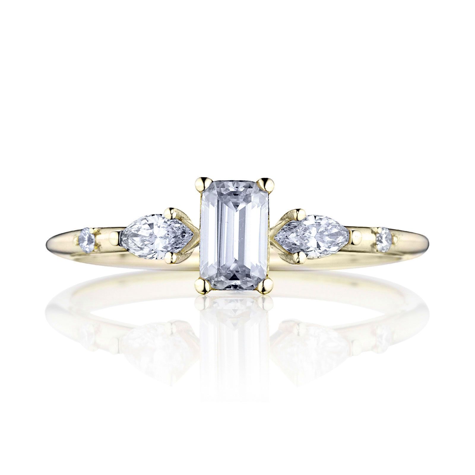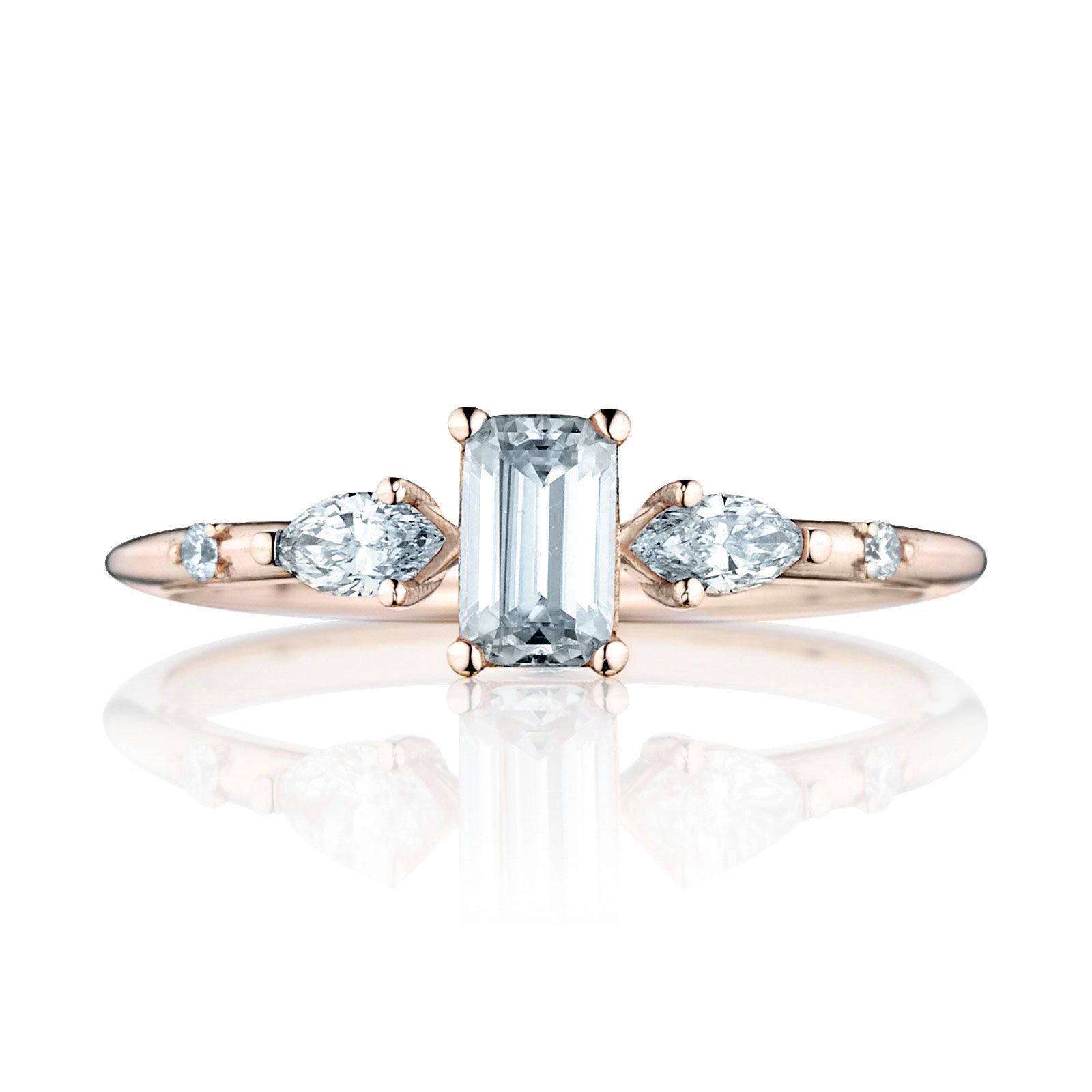 Zásnubný prsteň Zora zaujme hneď na prvý pohľad. Tento šperk je vyrobený zo 14, 18 karátového zlata alebo platiny. Na produktovej fotke môžete vidieť centrálny drahokam v tvare emerald s hmotnosťou 0,30ct a bočné kameňe v tvare markíza a briliant s hmotnosťou 0,20ct a 0,02ct. Vybrať si môžete medzi moissanitom, laboratórnym alebo prírodným diamantom.