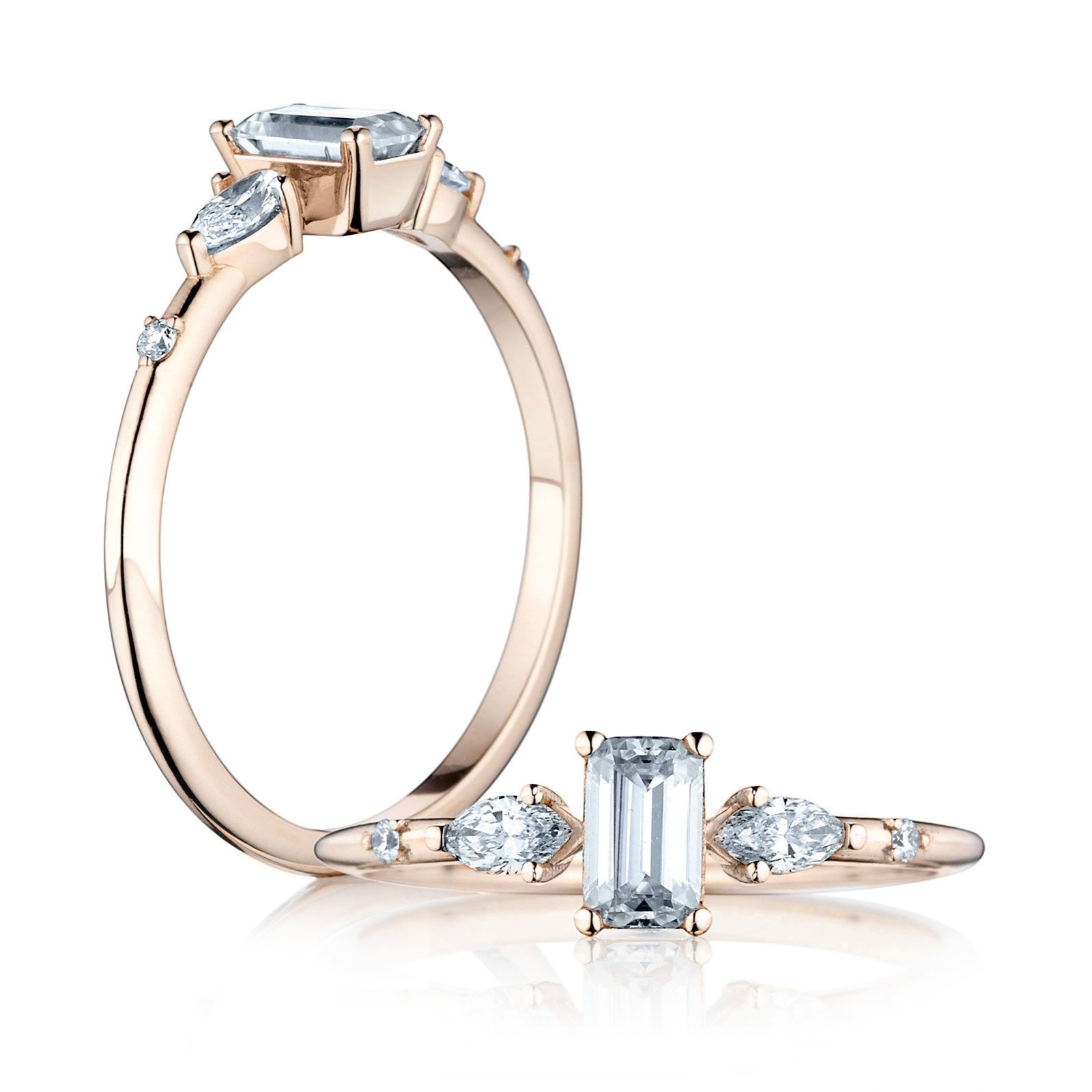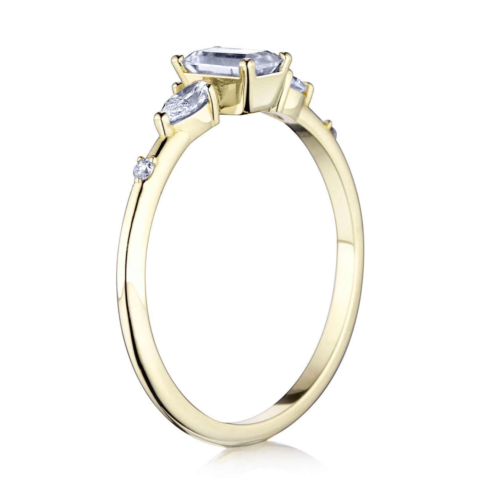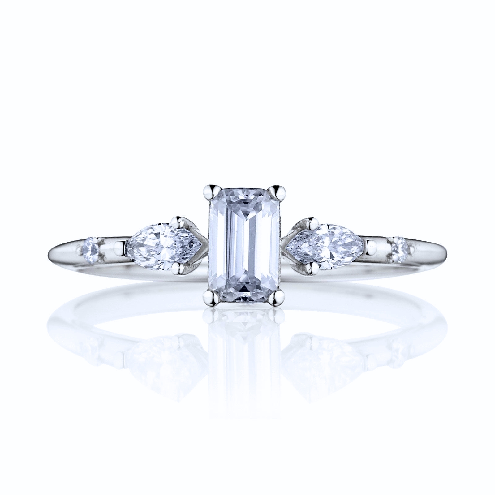 Zásnubný prsteň Zora zaujme hneď na prvý pohľad. Tento šperk je vyrobený zo 14, 18 karátového zlata alebo platiny. Na produktovej fotke môžete vidieť centrálny drahokam v tvare emerald s hmotnosťou 0,30ct a bočné kameňe v tvare markíza a briliant s hmotnosťou 0,20ct a 0,02ct. Vybrať si môžete medzi moissanitom, laboratórnym alebo prírodným diamantom.